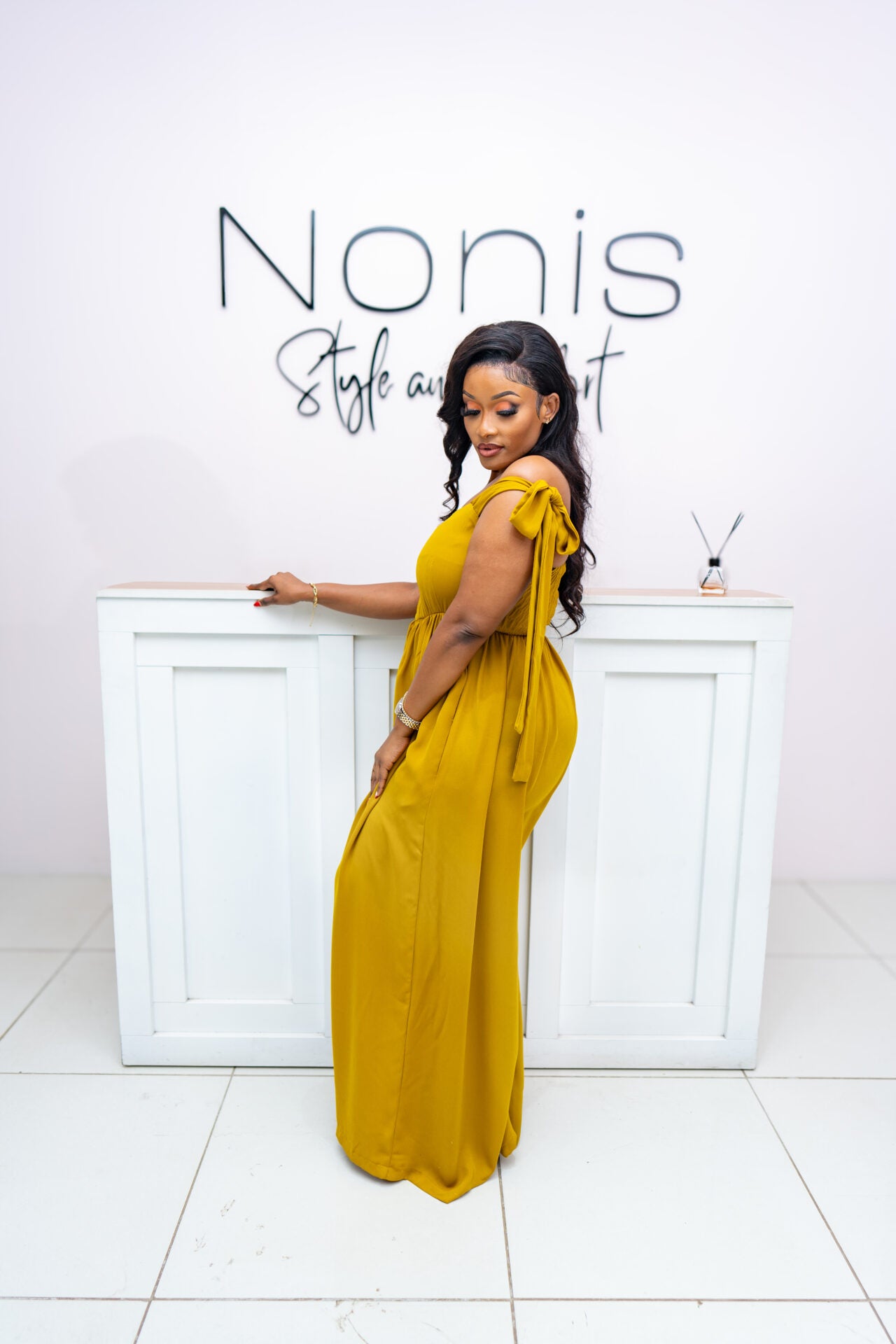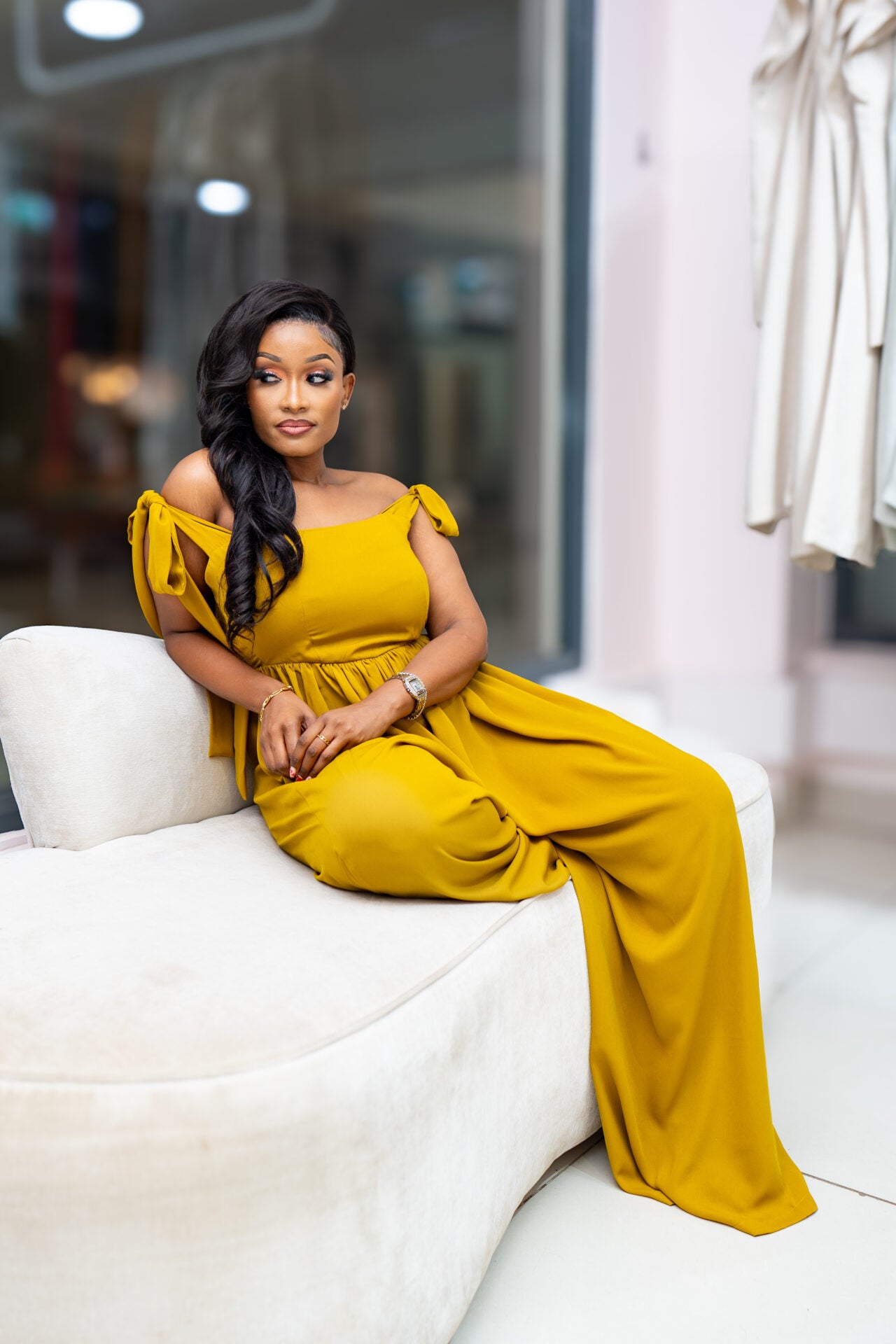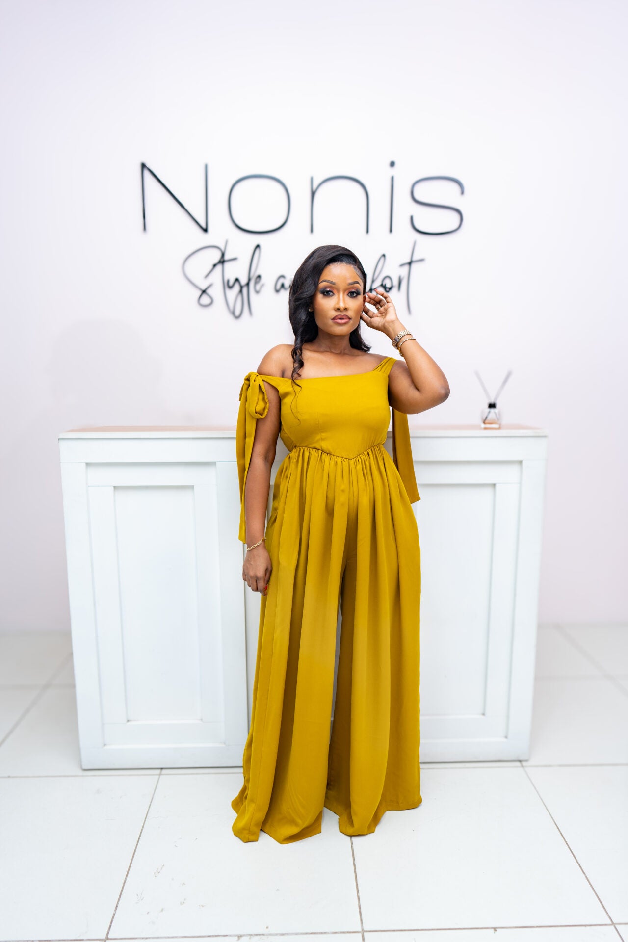 Jasmine wide-leg jumpsuit combines trendy style with practicality and comfort. The off-shoulder neckline showcases the shoulders and collarbones, adding a touch of elegance and femininity to the look. It has ties to allow you to fit it to your liking. The wide-leg silhouette of the jumpsuit creates a flattering and elongating effect, offering a chic and sophisticated aesthetic. At the back, ruching detail allows for adjustable fitting to accommodate different bust sizes. It ensures a snug and secure fit around the bust area while maintaining a sleek and streamlined appearance.