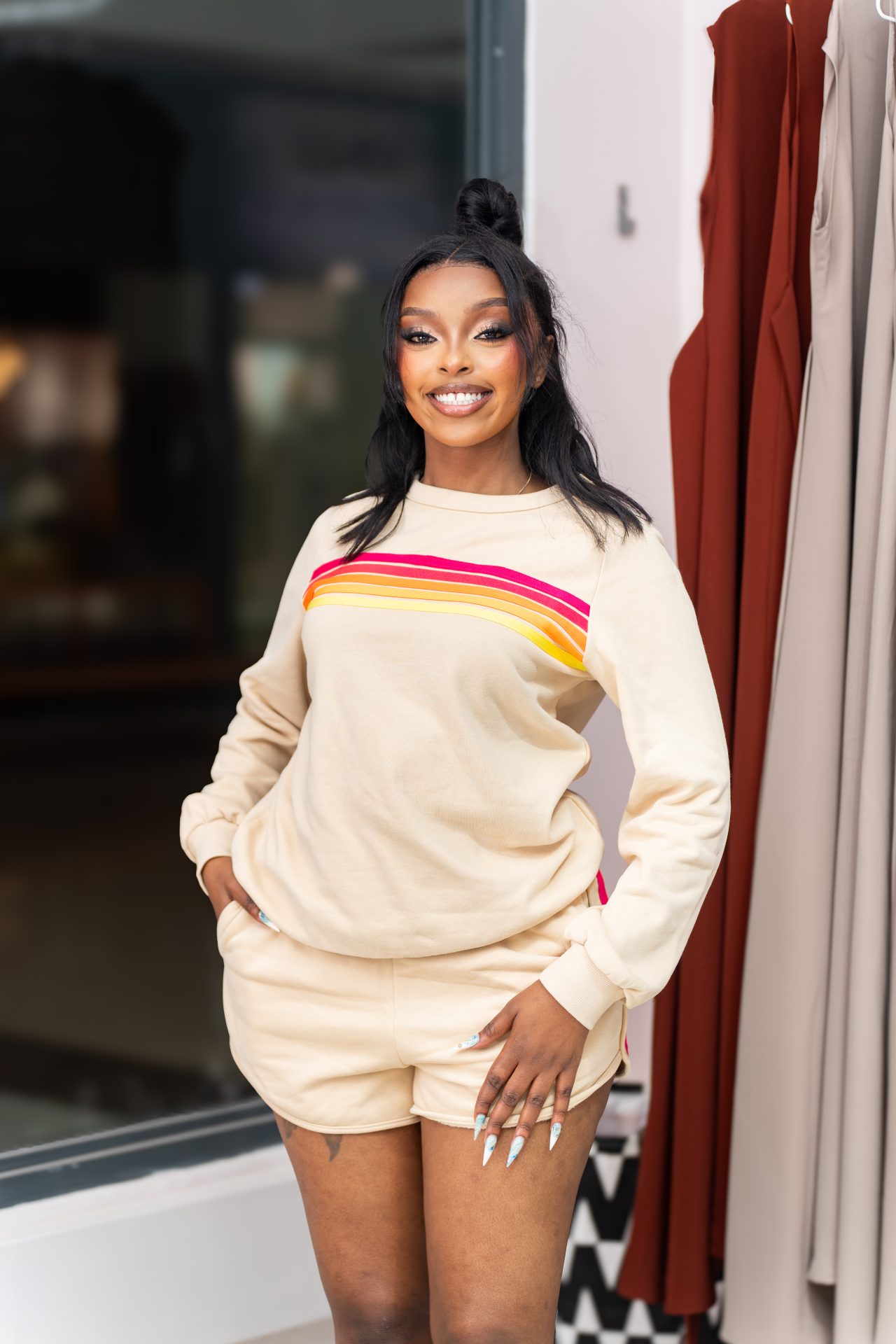Model is wearing a size M (Bust: 33”, Waist: 29”, Hips: 44”, Height: 5’3”).