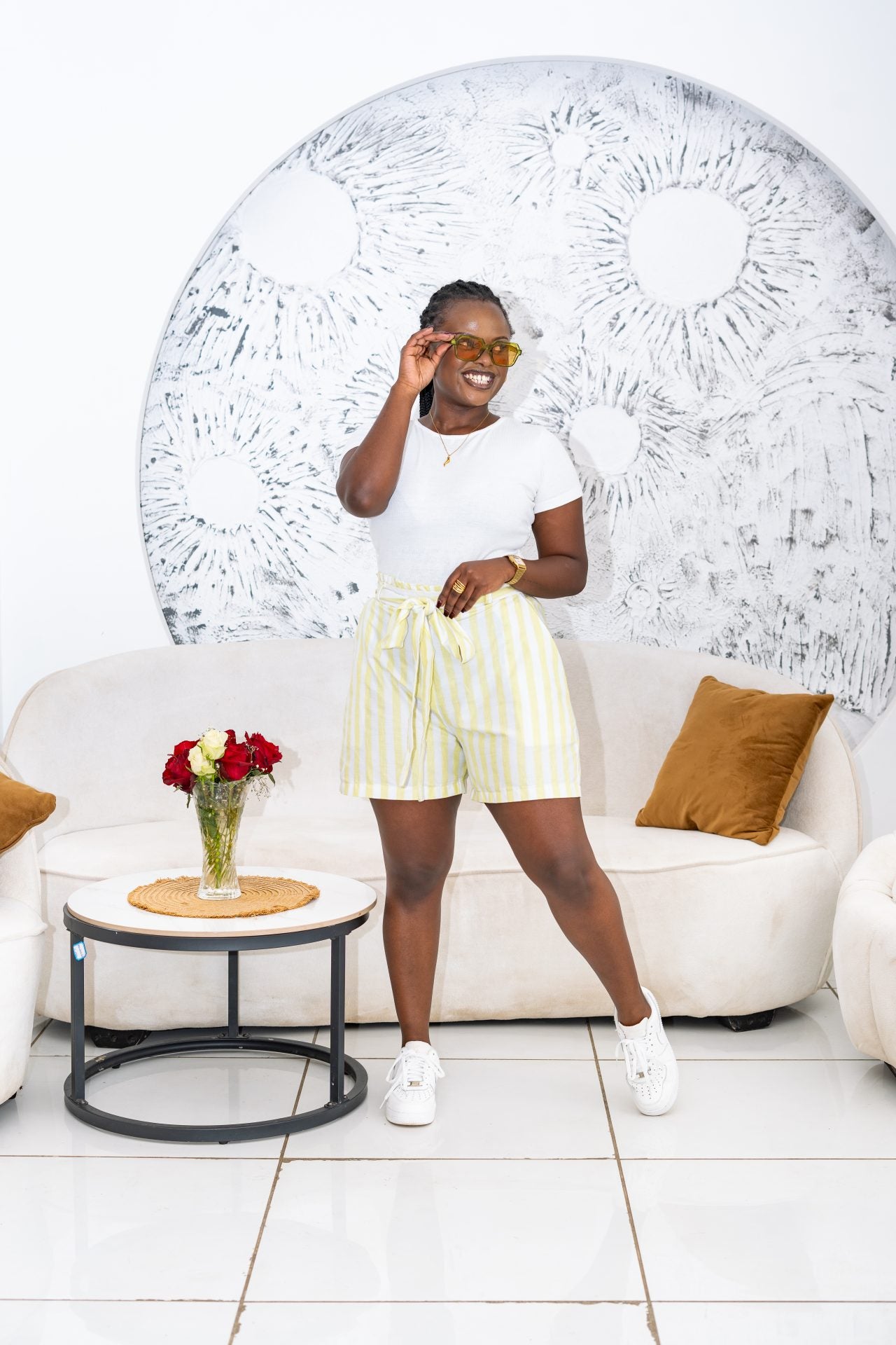 The Pastel Striped Shorts bring a playful twist to warm-weather dressing, with soft rainbow-hued stripes and a feminine ruffled waistband. The adjustable front-tie belt cinches the waist for a flattering silhouette, while the relaxed fit keeps things breezy and comfortable. Finished with functional side pockets, they’re the perfect mix of charm and practicality — ideal for pairing with your favourite summer tops.