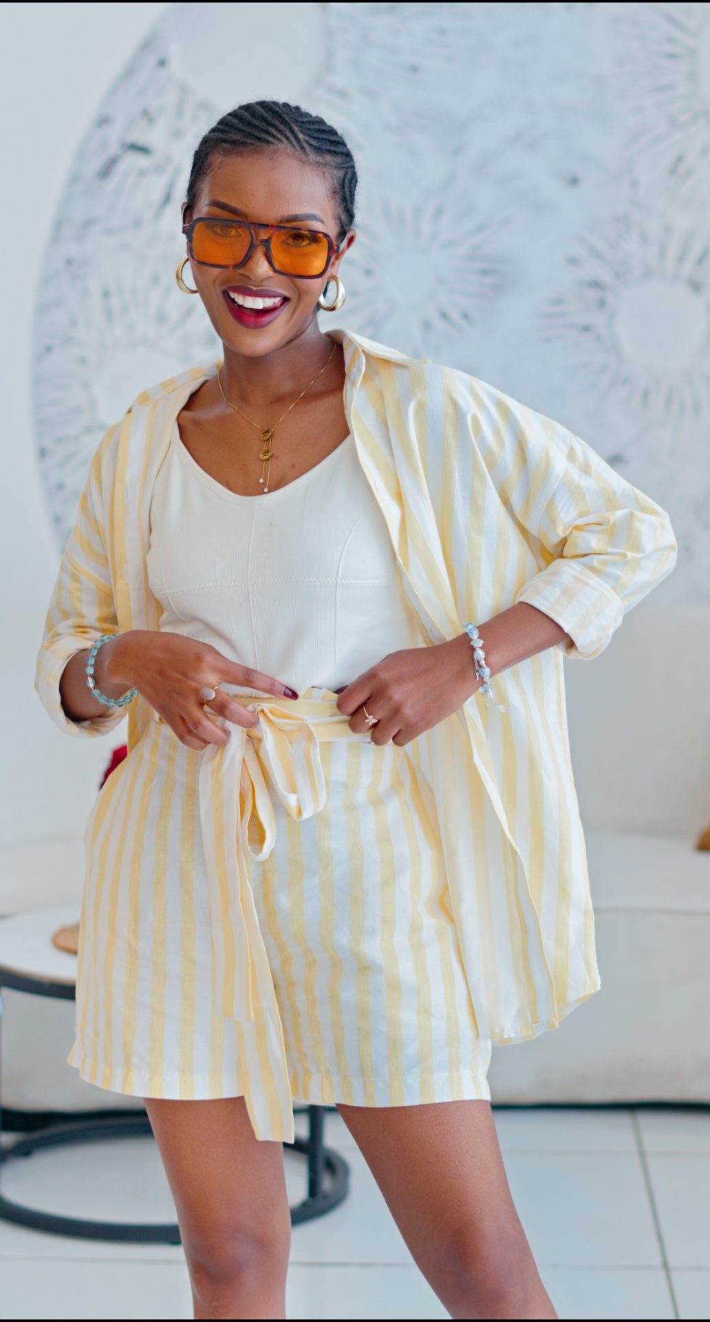 The Pastel Striped Shorts bring a playful twist to warm-weather dressing, with soft rainbow-hued stripes and a feminine ruffled waistband. The adjustable front-tie belt cinches the waist for a flattering silhouette, while the relaxed fit keeps things breezy and comfortable. Finished with functional side pockets, they’re the perfect mix of charm and practicality — ideal for pairing with your favourite summer tops.